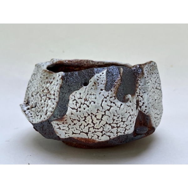它不僅能被使用,更值得被凝視與感受——融合了實用與雕塑的元素,是極為獨特的存在。 茶碗當然應該手感良好、易於使用,但我的創作目標並不是追求完美。恰恰相反,正是那些不完美,使茶碗有了生命,也讓人更容易與它產生連結——那是一種人性化的存在。我所製作的茶碗,多以較為隨性的拉胚或手工雕塑成形,再以自由揮灑的筆觸塗上鐵釉,表現出即興的動感。局部施以志野釉,並以柴窯燒製約十五小時完成。