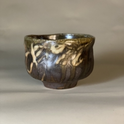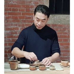 現階段創作以岩花紋及木紋入陶,每個面都有不同紋路,隨著柴燒落灰及火痕造就了多變的顏色肌理,猶如色彩豔麗的大理石及斑裂木皮,表面還附著礦物結晶所產生的墨綠斑點,像極了岩石或木皮上的青苔,讓器韻更有古樸之感。