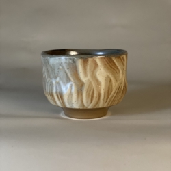 My current work incorporates rock-like and wood-grain textures into the clay body. Each surface reveals a different pattern, and the unpredictable effects of wood firing—falling ash and flame marks—create rich variations in color and texture. The result often resembles vividly colored marble or cracked bark. Mineral crystallization during firing also leaves dark green specks on the surface, reminiscent of moss growing on stone or wood. These qualities lend the work an ancient, rustic character.