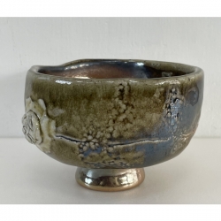 After four days and three nights of high-temperature treatment at more than 1250 degrees, the wood-fired chawan becomes a world unto itself. The size, streamlined shape and textures are all the result of a creative process that culminates in a chawan that is unique. Additionally, the wood-fired falling ash glaze waterfall and multi-colored crystalline glazes contribute in presenting a world of natural simplicity that is warm and layered all within the tea bowl.